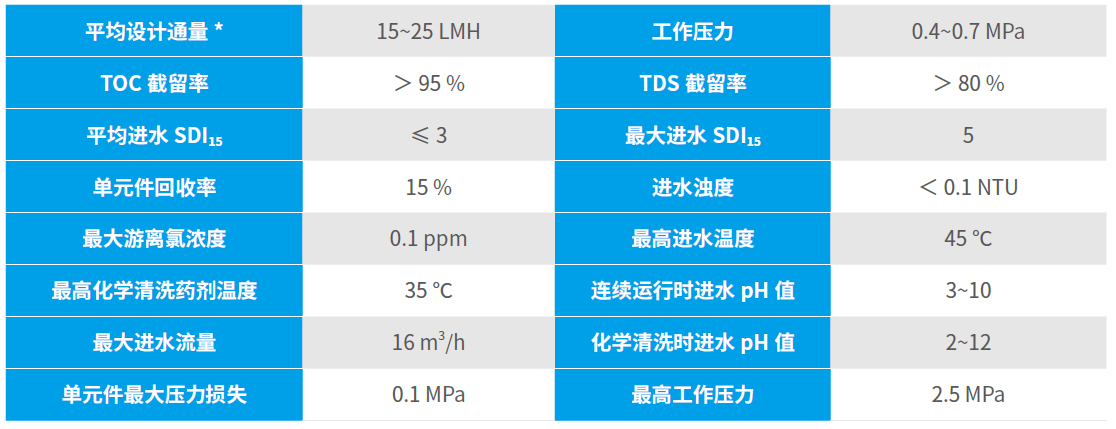 工作壓力低 系統工作壓力0.4~0.7 MPa,較傳統低壓反滲透膜低30 % 以上;