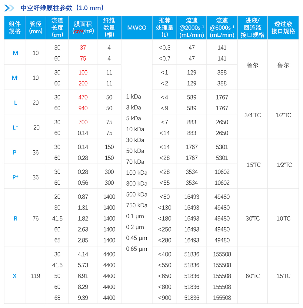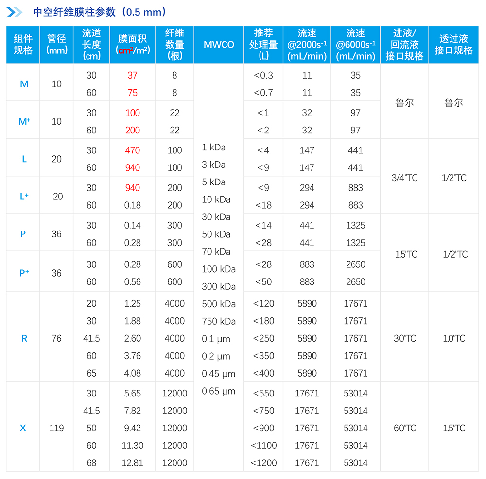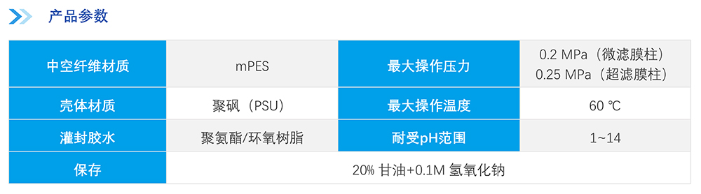 中空纖維膜絲采用改性聚醚砜(mPES)制備,抗污染性能強(qiáng);非對(duì)稱梯度孔結(jié)構(gòu)及均一孔徑保證高過(guò)濾精度的同時(shí)能獲取更高通量,提高產(chǎn)品收率。中空纖維膜柱采用符合醫(yī)療級(jí)別的外殼材料,生物相容性優(yōu)異,在滅菌環(huán)境中穩(wěn)定性優(yōu)良;選用的膠黏劑粘接強(qiáng)度高,耐熱性、耐化學(xué)性及生物相容性優(yōu)良;同時(shí)采用優(yōu)化的注膠工藝,注膠精度高,產(chǎn)品無(wú)缺陷。