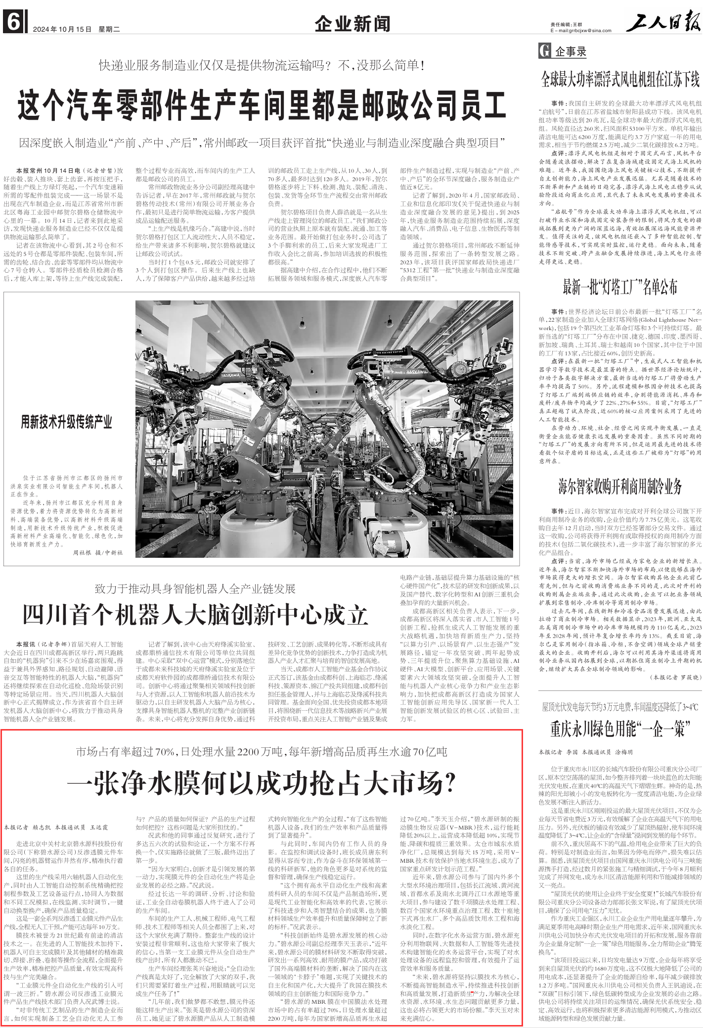 走進北京中關村北京碧水源科技股份有限公司(下稱碧水源公司)反滲透膜元件車間,閃亮的機器臂運作井然有序,精準執行著各自的任務。